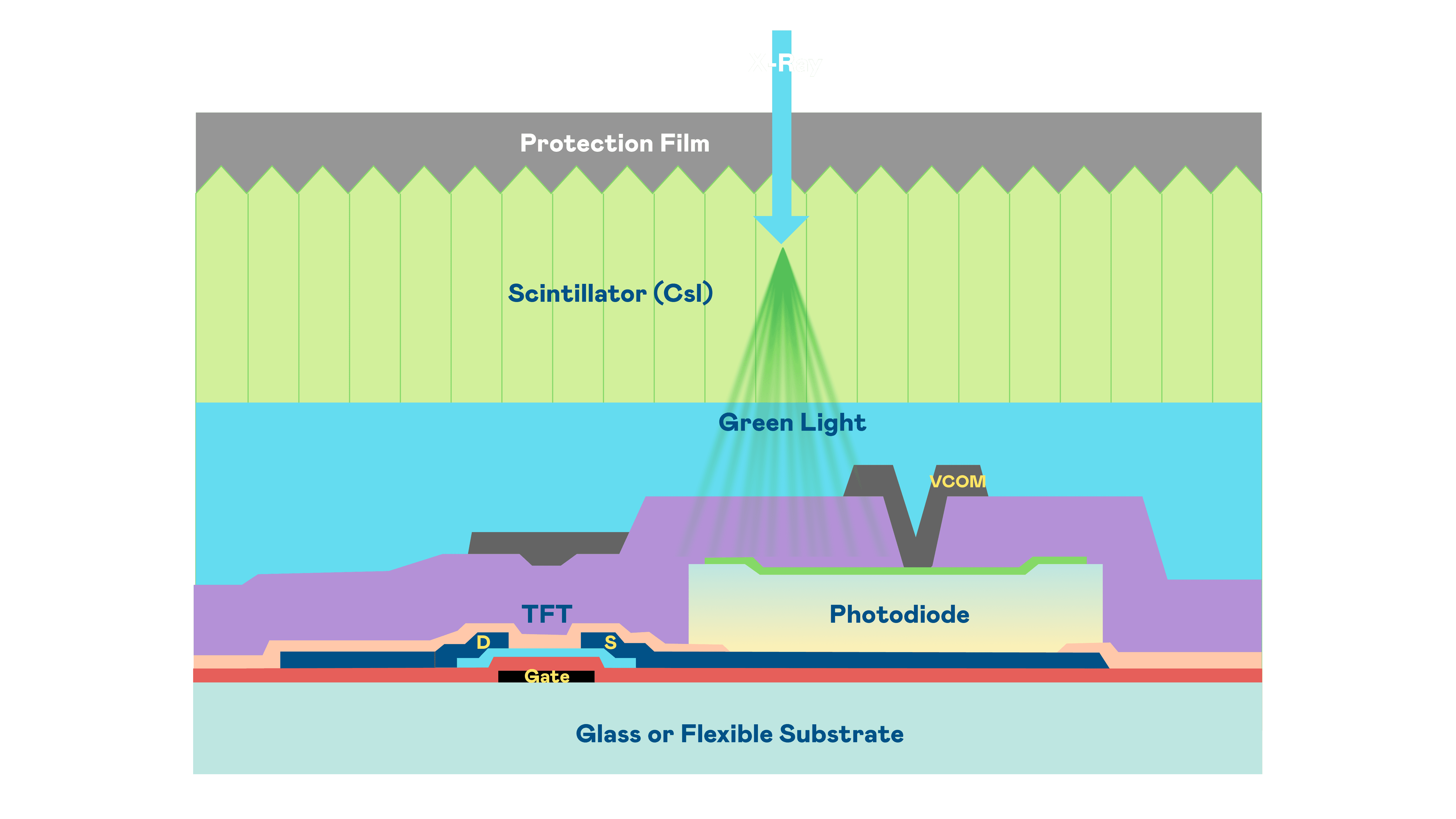 壹号平台的X光影像感测阵列使用薄膜电晶体 (TFT) 作为每个像素的读取开关,,,,搭配光电二极体(Photodiode)的光电转换元件,,,用以感测X光影像讯号。。